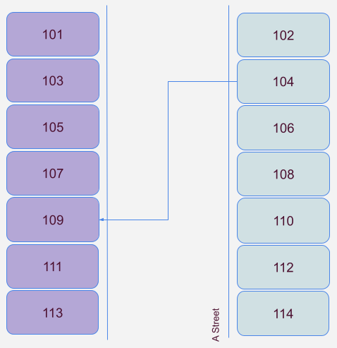 Consider a street (`A street`) with a bunch of houses - 101 to 114.