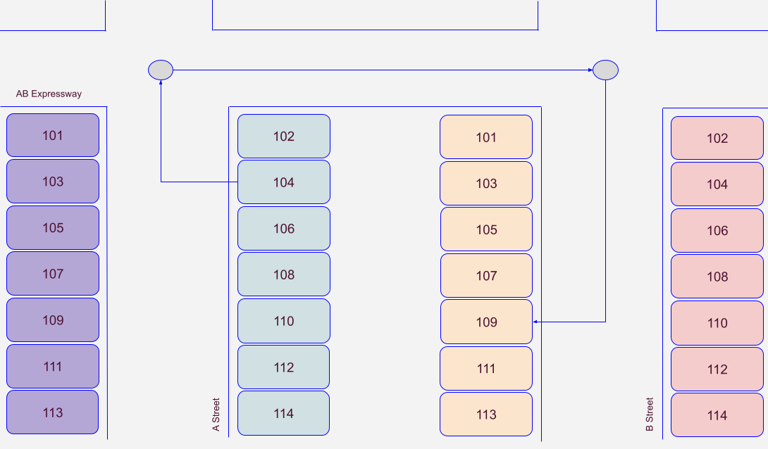 Similar to previous example, you want to send a package from House # 104 to House # 109, but now both the houses are in a different street. In order to carry the package between the streets, you would have to go through an intersection (AB expressway and A street). At the intersection, you decide that the best route to B is to take a `Right` turn and proceed towards B street. Once you reach B street, you would then carry the package to its destination House # 109, B street.